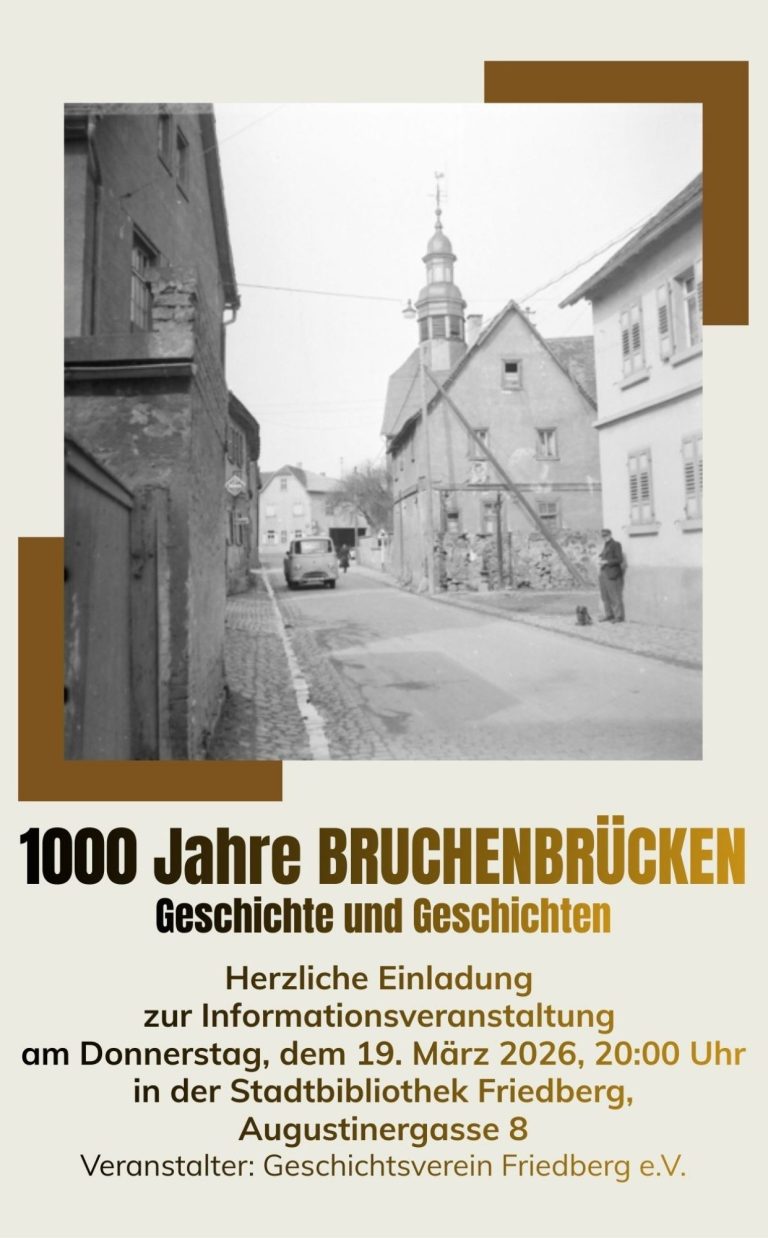 Bruchenbrücken feiert sein 1000‑jähriges Bestehen. Grundlage für die Datierung ist der Codex Eberhardi, eine zwischen 1150 und 1160 entstandene Urkundensammlung des Klosters Fulda. Darin wird Bruchenbrücken im Zusammenhang mit der Gründung des Klosters Neuenburg zwischen 1021 und 1039 erstmals erwähnt – daher wurde 2026 als Jubiläumsjahr festgelegt.Die Stadt würdigt das große Engagement der Bruchenbrückener Bürgerinnen und Bürger und unterstützt das Jubiläum aktiv. Unter Federführung des Stadtarchivs entsteht die erste Ortschronik, die Geschichte, Entwicklung und Besonderheiten unseres Dorfes festhält.Der Vortrag gibt Einblicke in Aufbau und Inhalte der Chronik, beleuchtet zentrale Aspekte der Ortsgeschichte und zeigt, was uns am Festwochenende vom 12. und 14. Juni erwartet. Auch die Jubiläumsprodukte können erworben werden.